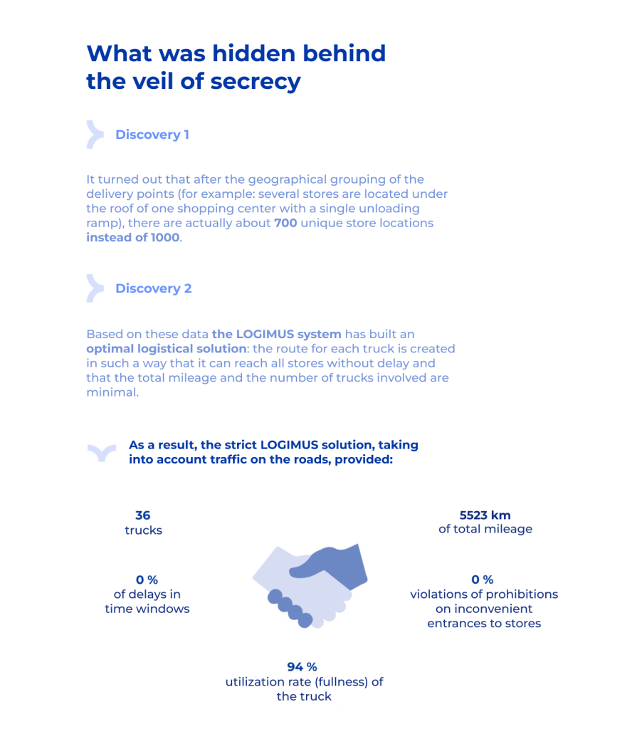 The CEO was surprised only by the annual savings figure itself (about 2 million US dollars). Since, according to the internal accounting system in ERP, all transport costs of the enterprise for the year were only a couple of times higher.