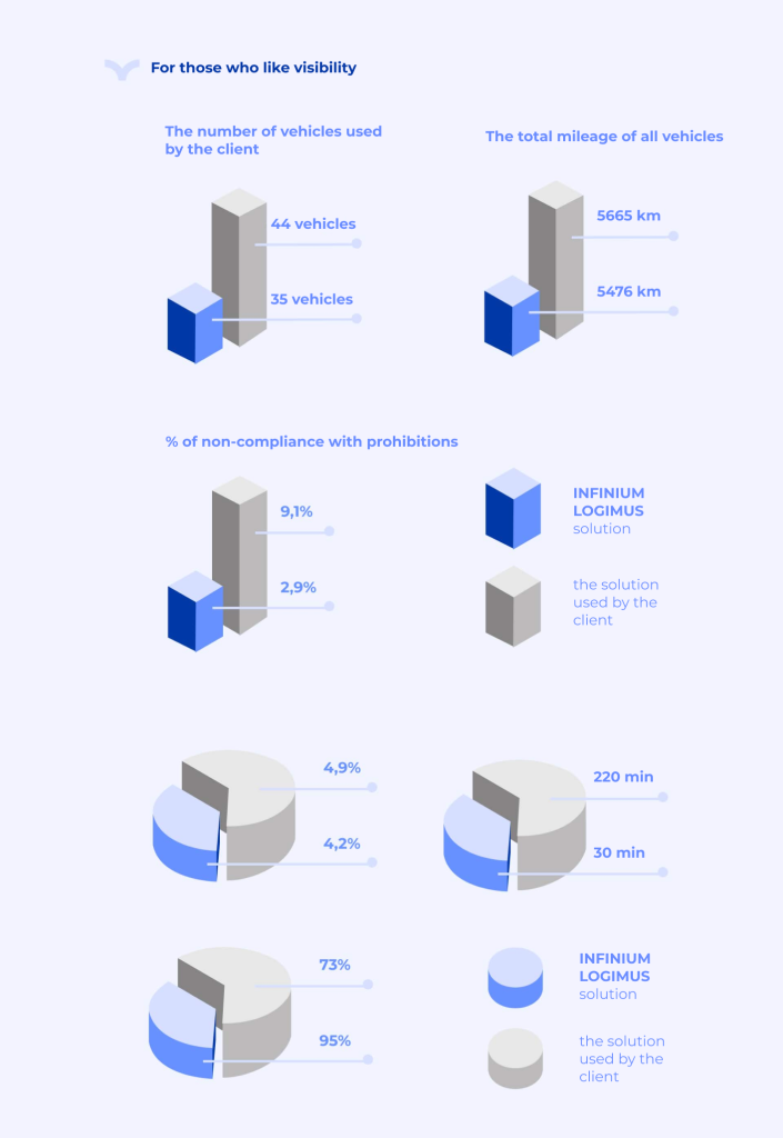 But I didn’t want to stop there. INFINIUM specialists reasoned as follows: the company has developed a practice of being late during time intervals and violating prohibitions on inconvenient entries. This is considered acceptable – neither customers nor drivers complained. This means that the LOGIMUS System can also be allowed to build an optimal solution with a small number of delays and violations (but no more than the historically established percentage of these delays and violations in the enterprise).
