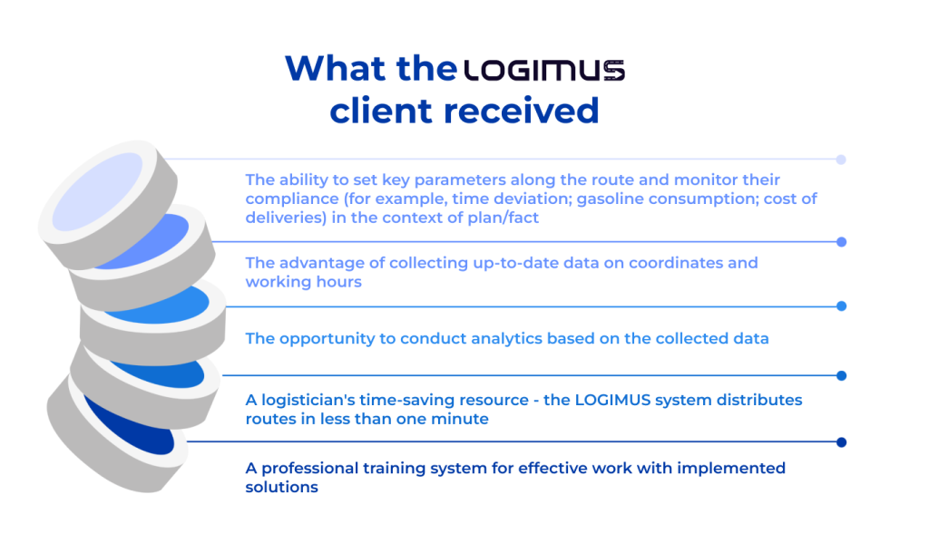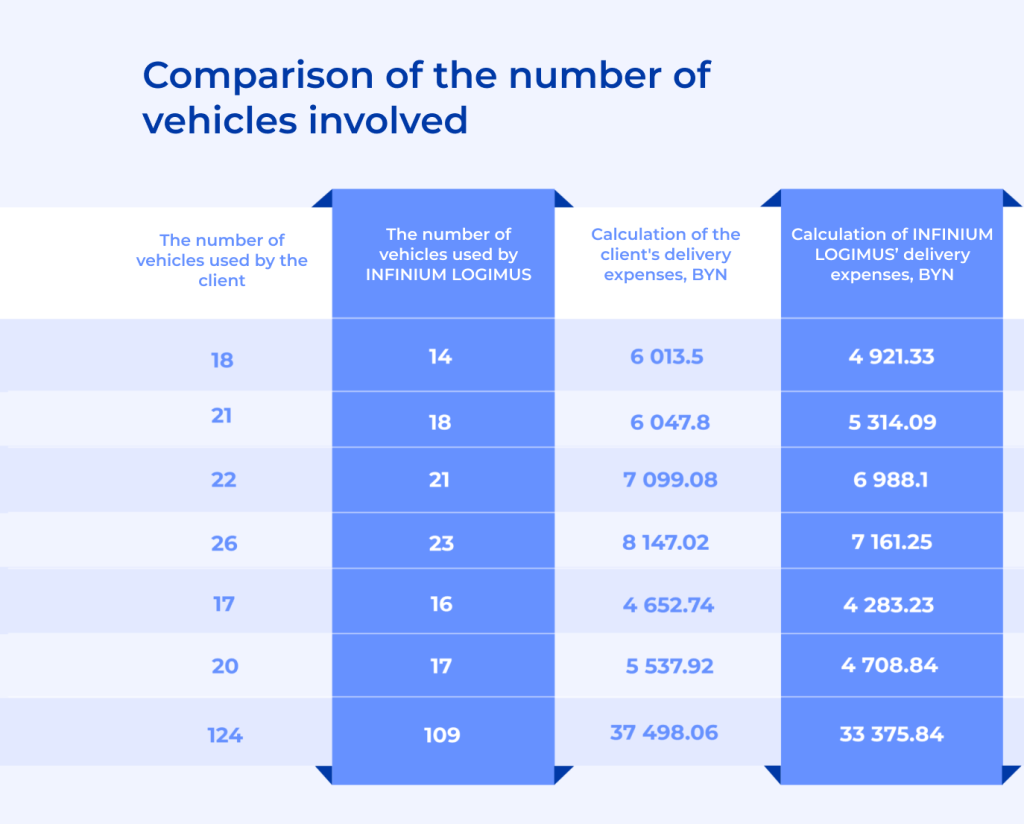 The second contact took place with those who understood that without adjustment and automation it was possible to continue working only at a loss. It was decided to introduce INFINIUM LOGIMUS to the client for a test period, to give the client the opportunity to “play around” himself, to feel the difference on his own. And already during this period, the effectiveness was proven on a typical period with all the inputs – the number of vehicles, the number of delivery points, the volume of cargo, etc.