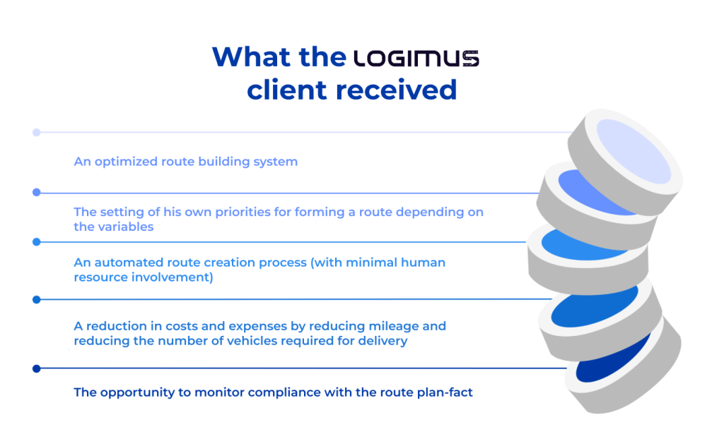 As a result of route optimization, costs were significantly reduced and the quality of service was improved, and the optimal number of orders was completed, provided that all client requirements were met.