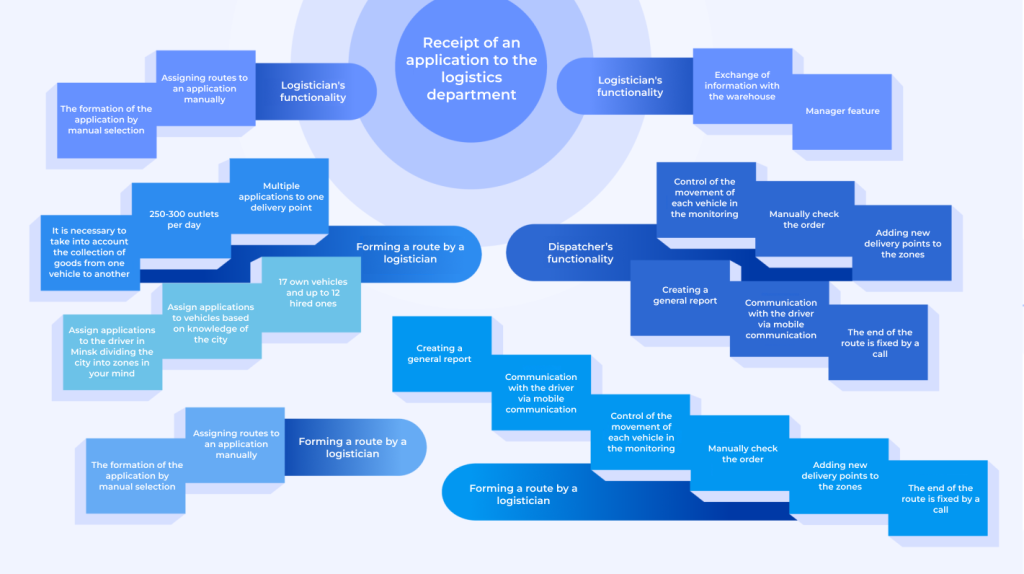 ▶ The city of Minsk was divided into conditional zones by a logistician + delivery to the regions. The dispatcher tracked visits to retail outlets through monitoring and checked the order, while he had to select each car separately.