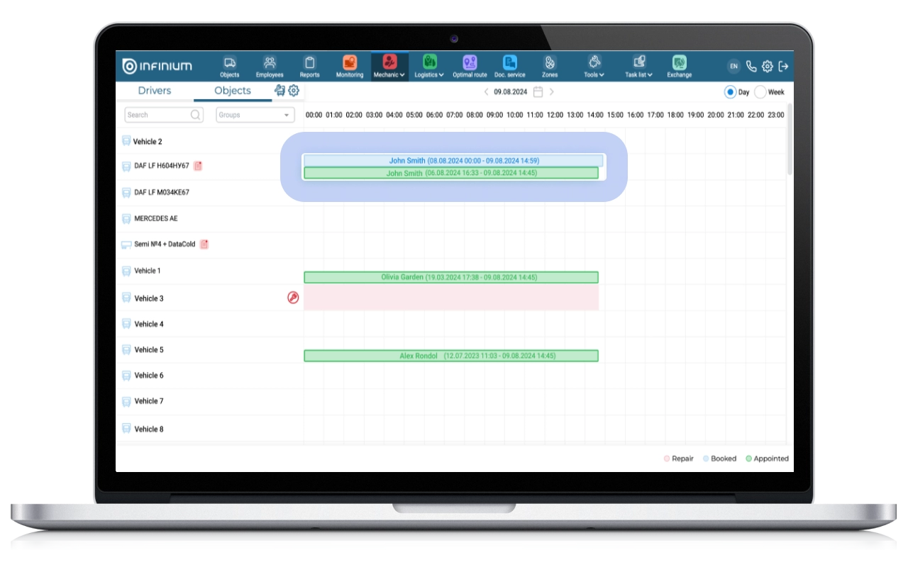 Previously, the Mechanic/Cars section only displayed the vehicle booking time. Now we have added a display of the time the car was assigned to the driver, which shows information about who used the car and when. Thus, you can now graphically compare the time of booking and the actual time of using the car, and this is very convenient.