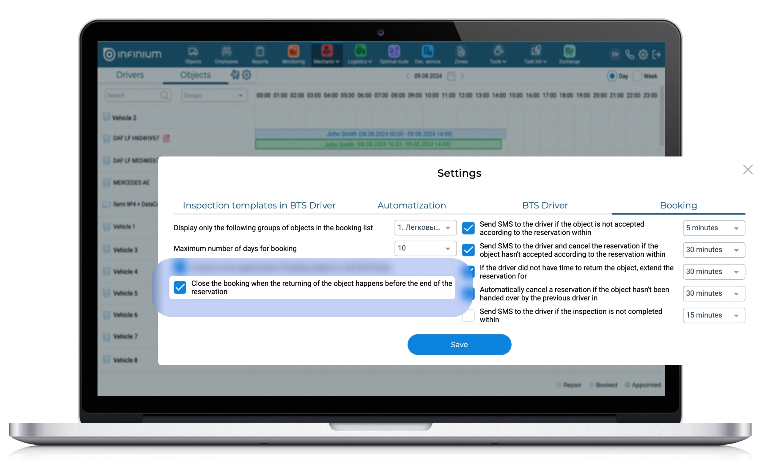 To solve the problem, a checkbox “Close the booking when the returning of the object happens before the end of the reservation” has been added to the settings of the “Mechanic” section so that the planned time of booking (if the driver returns the car at an earlier date) automatically changes to the actual time of delivery of the car. Thus, the reservation will be cut off after the driver clicks the “Return” button in the Driver App mobile application.