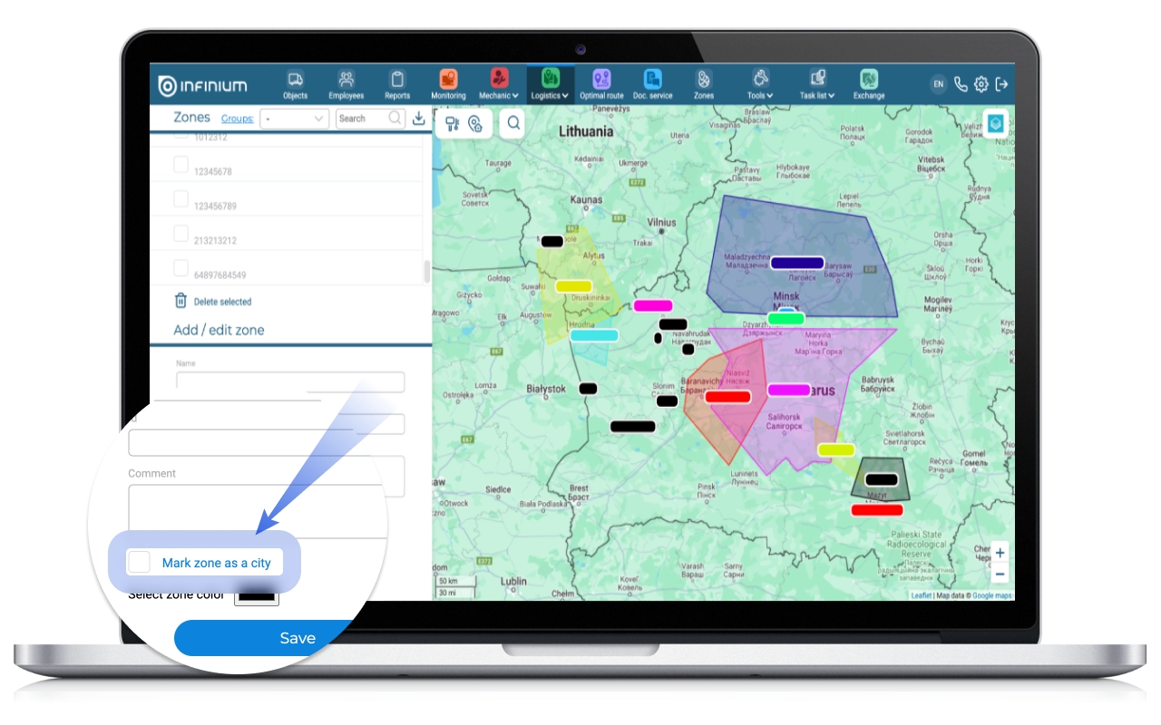 When setting this criterion along a route, the presence/absence of a mark in the “Mark zone as a city” checkbox in the “Zones” subsection in Logistics is taken into account:
